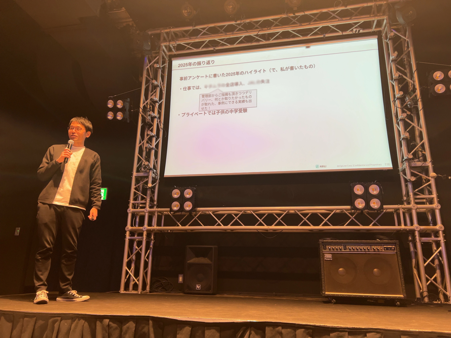 ワークで導き出された解答は、今年の思い出を振り返るために必要なキーワードになるという建付けになっていました(実行委員の細かい仕込み!)。Palくんが2025年の思い出が詰まった動画を再生すると、会場は静まり返り、白熱した空気の温度が一気に下がっていくようでした。各々が各々の想いを胸に、スクリーンを見つめながら、静かに1年間を振り返りました。