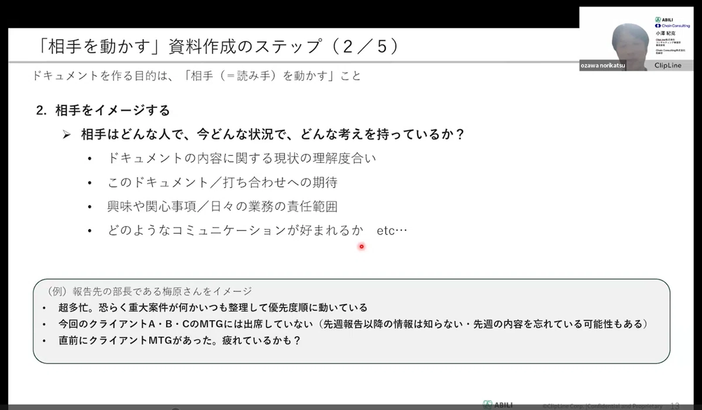「伝える」という自分主体の視点ではなく、読んだ後の相手に「どう動いてほしいか」というゴールから逆算する。この本質を捉えるために、「相手を動かす」資料作成のステップとして、6つのステップが共有されました。