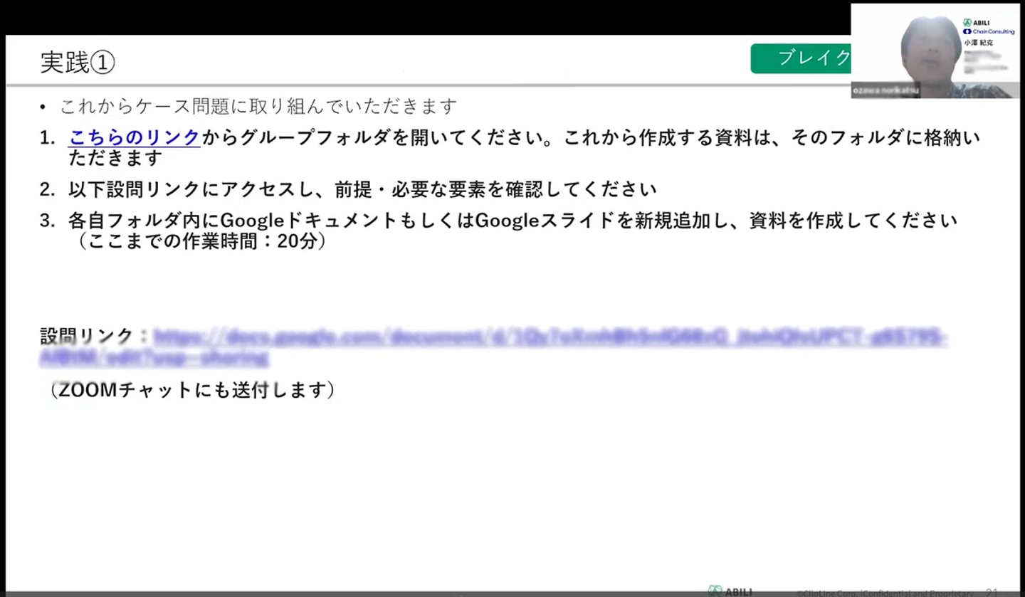 当社の勉強会は、座学だけで終わることはありません。1.5時間の枠の中で、講義の直後に参加者が個人で課題に取り組み、さらにオンラインの「ブレイクアウトルーム」でチームごとの相互レビューを行いました。