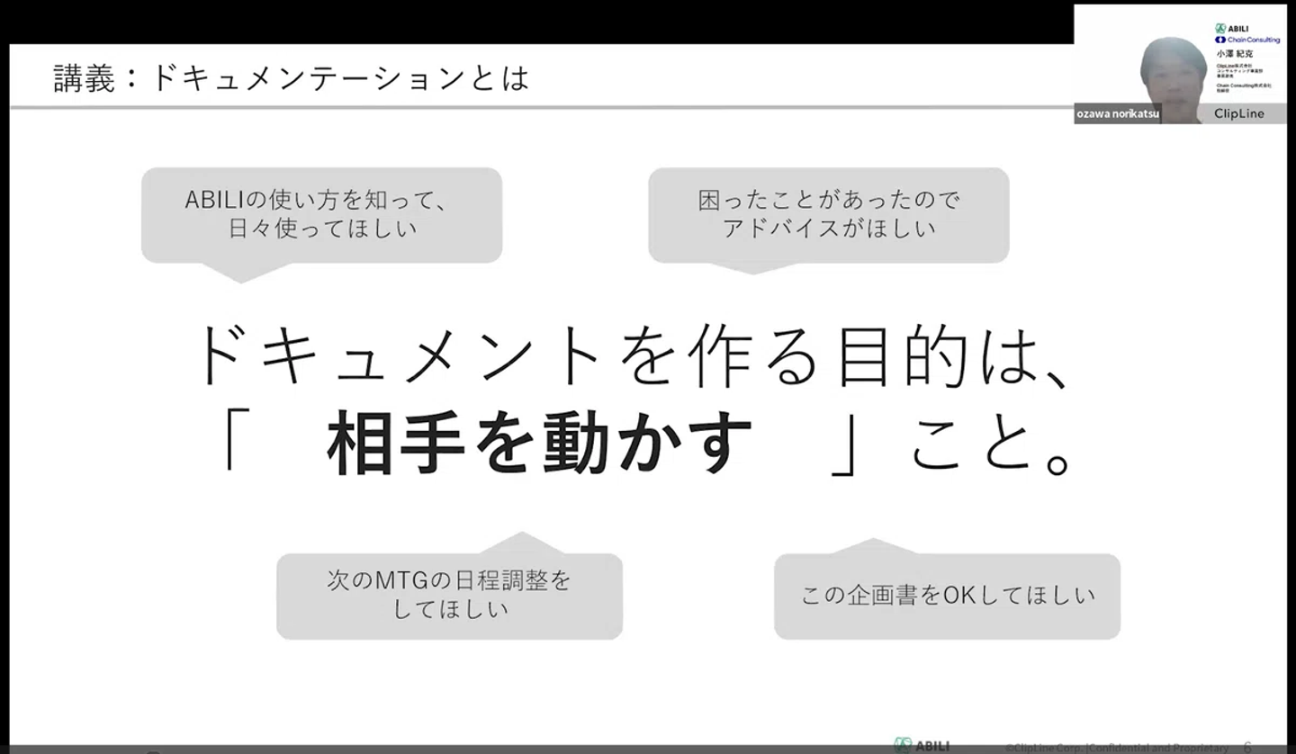 勉強会は、小澤さんからの「ドキュメントを作る目的は何ですか?」という問いかけから始まりました。参加者から「情報を伝える」「認識を合わせる」などといった意見が出る中、小澤さんが提示した答えは非常にシンプルでした。