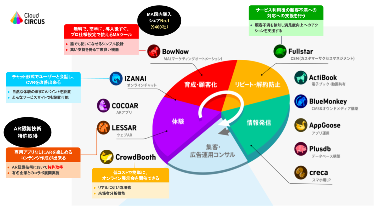 クラウドサーカスはSaaSを提供するソフトウェア企業であり、現在11個のサービスがありますが、たくさんのサービスを持っていることこそが、私たちがARサービスを集客ツールとして提供する意味だと思っています。つまり、ARだけを売っているわけではない点が重要になります。
