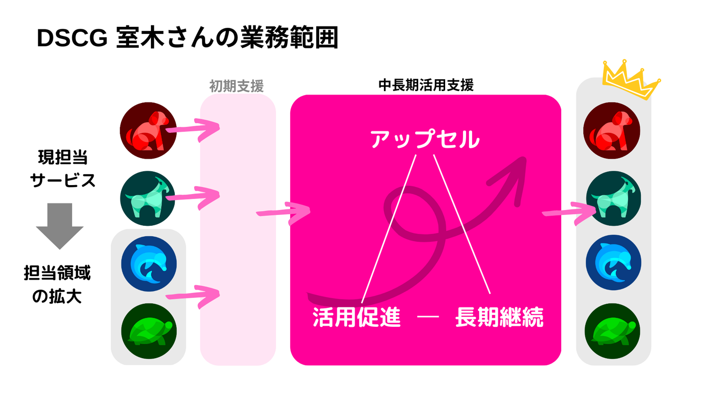 フェーズごとに担当は異なりますが、業務内容は基本的に同じです。主に2つの業務があり、1つ目はそれぞれのプロダクトで有料契約をいただいたお客様向けのCS業務です。2つ目は、プロダクトを通じたお客様の問題解決やプロダクトのアップデートに焦点を当てた勉強会です。