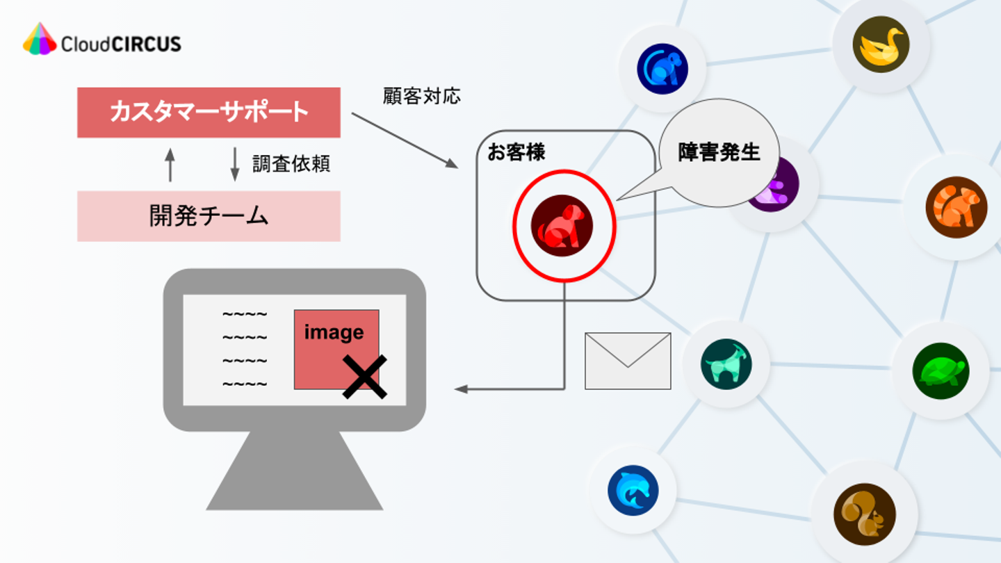 問題はおそらくBowNowのバックエンドにあり、フロントエンドやHTML/CSSの問題ではないと思われます。サーバー側の問題で、同時接続数が上限を超えると画像が表示されなくなる可能性があります。実際はどうなのかの調査が必要です。このように、カスタマーサポート部門では、私たちが扱う製品の問題が発生した際にお客様の対応をしたり、お客様が製品の使い方で困っているときにサポートを行います。
