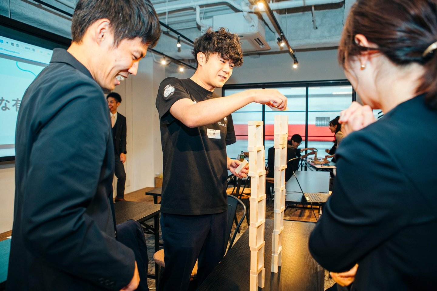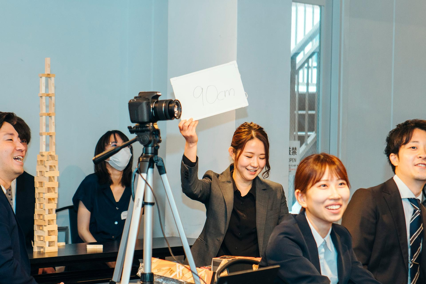各グループ内で、提示されたお題に回答しながらジェンガを積み上げて、終了時に一番高くまで積み上げられたチームが優勝というルール。途中で倒れてしまったらやり直しとなるため、保険として複数のタワーを建設しているチームもありました!