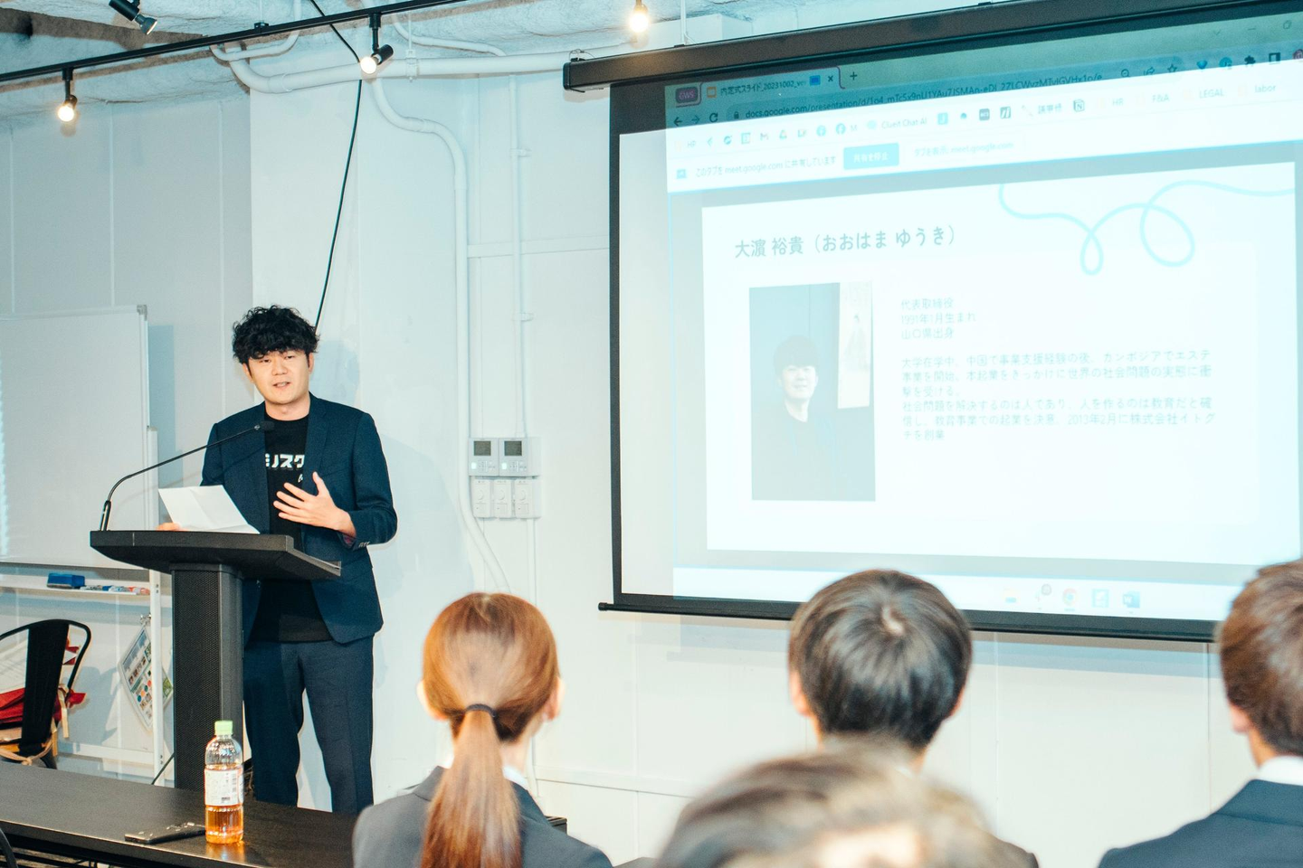 大濵自身の経歴の紹介から始まり、クルイトの展望、そして内定者のみなさんに期待することなど、温かく刺激になるお話をいただきました。内定者のみなさんはいよいよ社会人のスタートだという実感で身が引き締まる思いだったのではないでしょうか。