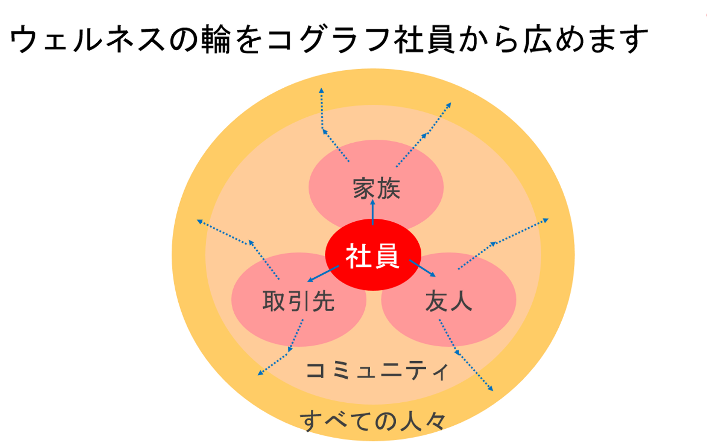 (ウェルネスの輪をコグラフ社員から広めていく)