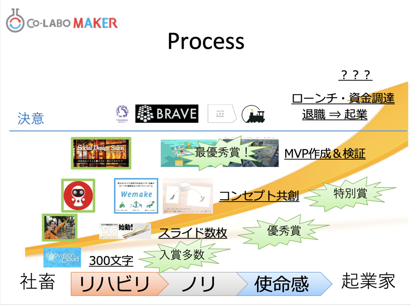 こうして、アクセラレータ「BRAVE」にも参加させていただきつつ、2017年1月に元の会社を辞め、大学の恩師の大学発ベンチャーに入り、2017年4月に東北大学の博士課程に入学しつつ、起業しました。