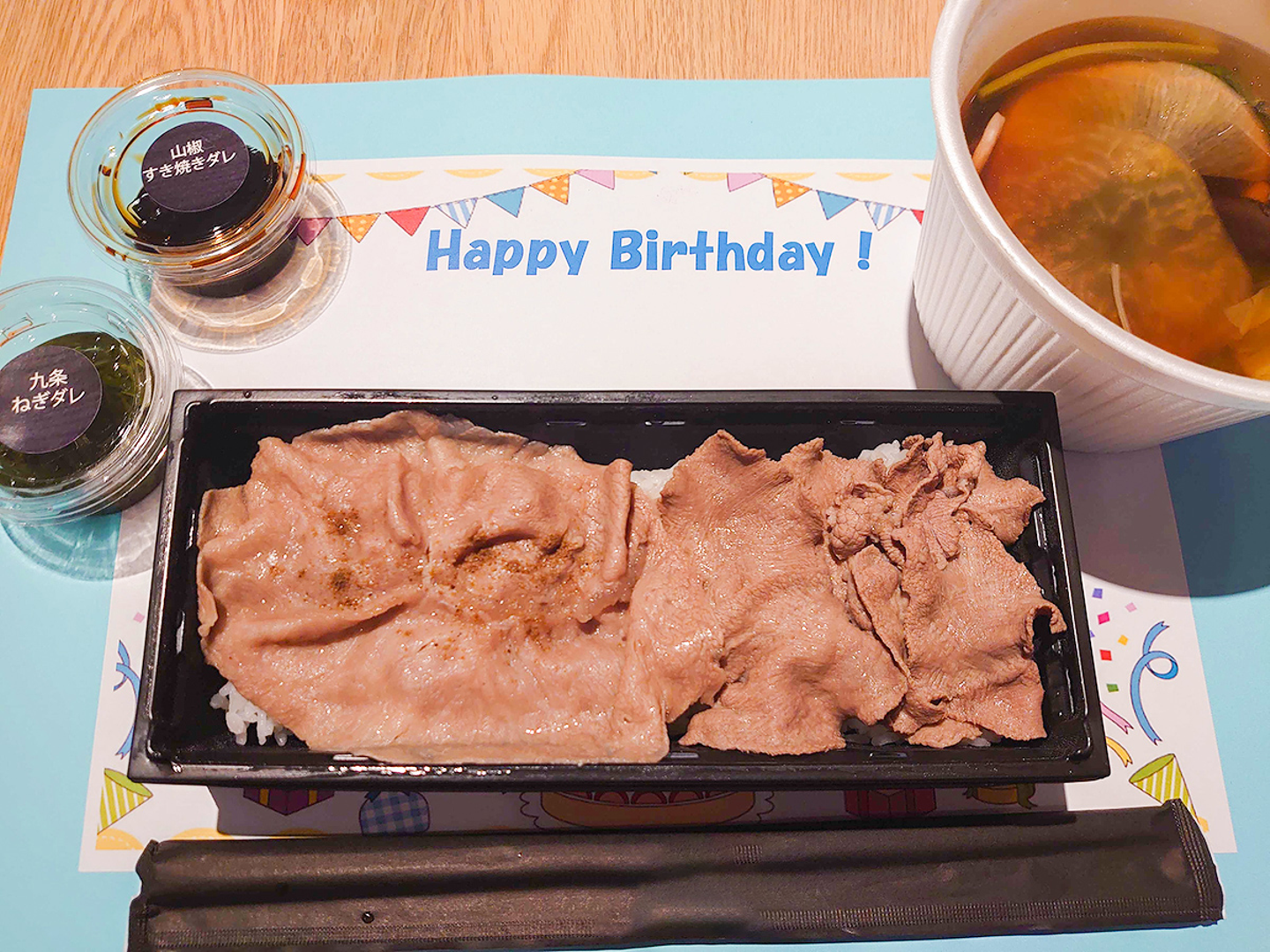 誕生日会のスペシャルランチは15種類の野菜が入ったスープと牛タン&ミスジのW弁当でした。
