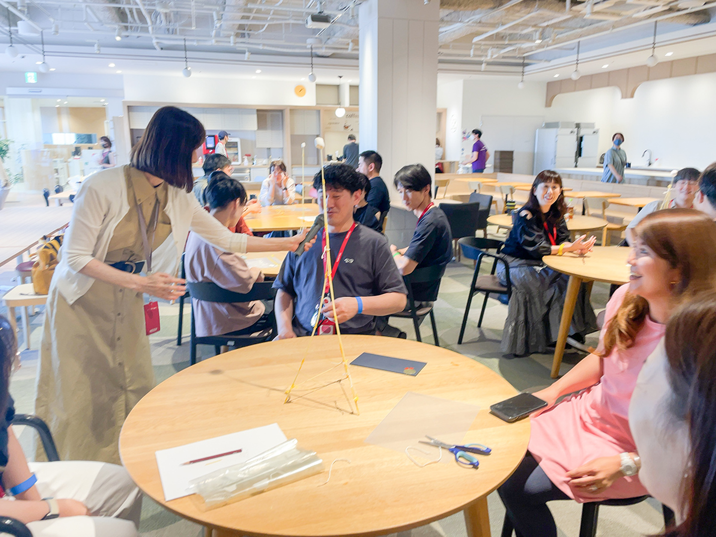 マシュマロチャレンジとはパスタ、テープ、ひも、マシュマロを使って決められた時間(18分間)内に自立可能なタワーを立てるゲームです。最も高いタワーを作ったチームが優勝となります。