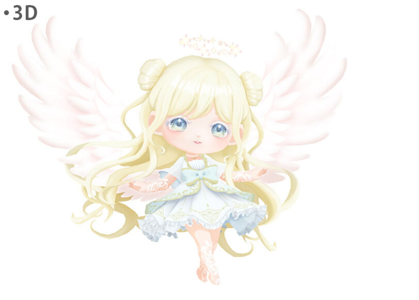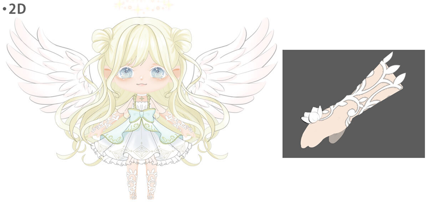 宮本さんが手がけたガチャ「天使の癒しの歌声」の2D、3Dデザイン画。細かな腕の装飾は個別に絵を描いた。天使の羽は人気アイテムだが、3Dでは表現が難しいアイテムの一つ。360°回転しても羽のテクスチャーが損なわれないよう工夫されている。