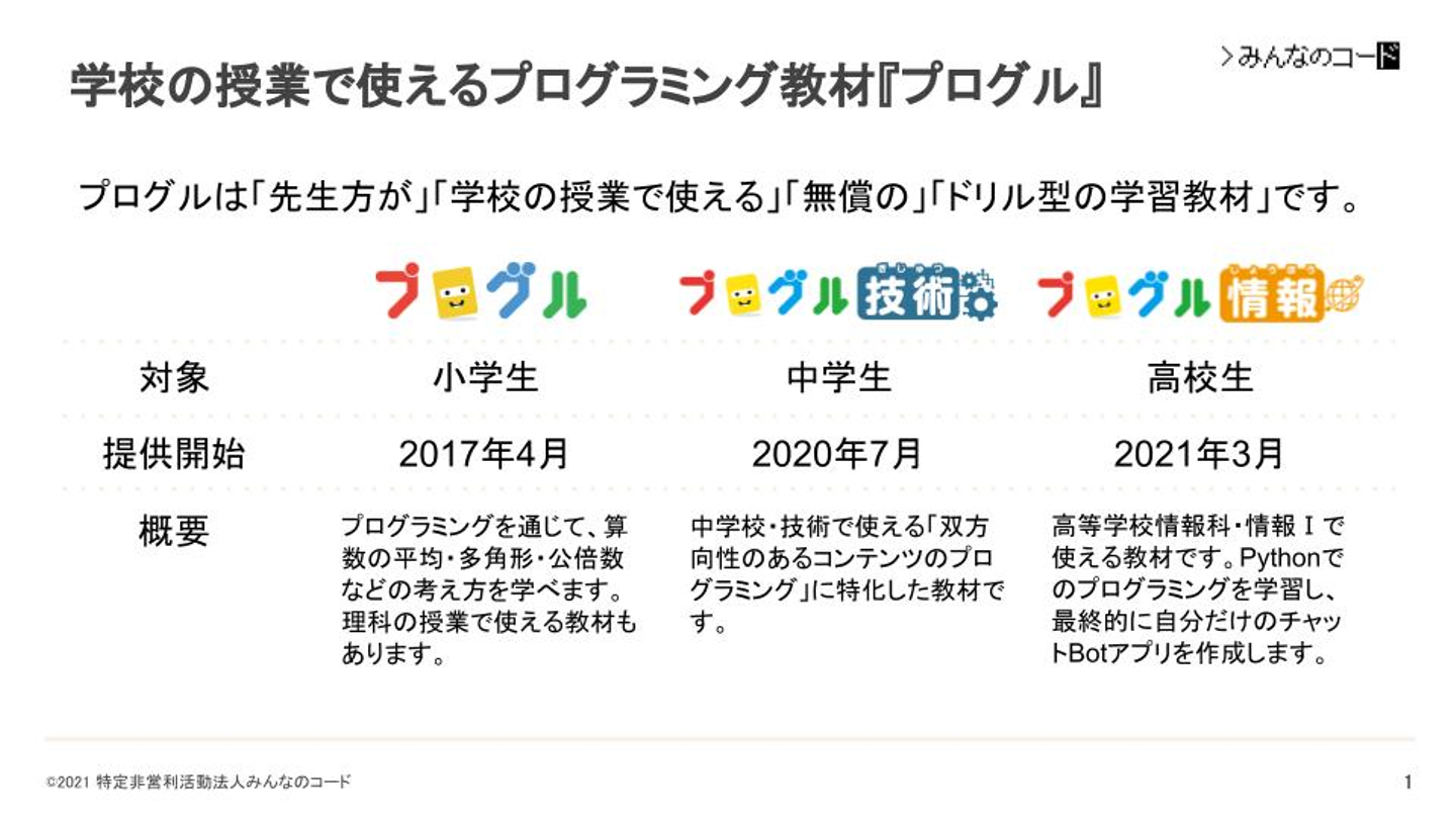 小学校の算数・理科の時間で使える教材として『プログル』、中学校・技術で使える『プログル技術』を提供しています。そして今年3月には、高等学校情報科・情報Ⅰで使える『プログル情報』を提供開始しました。