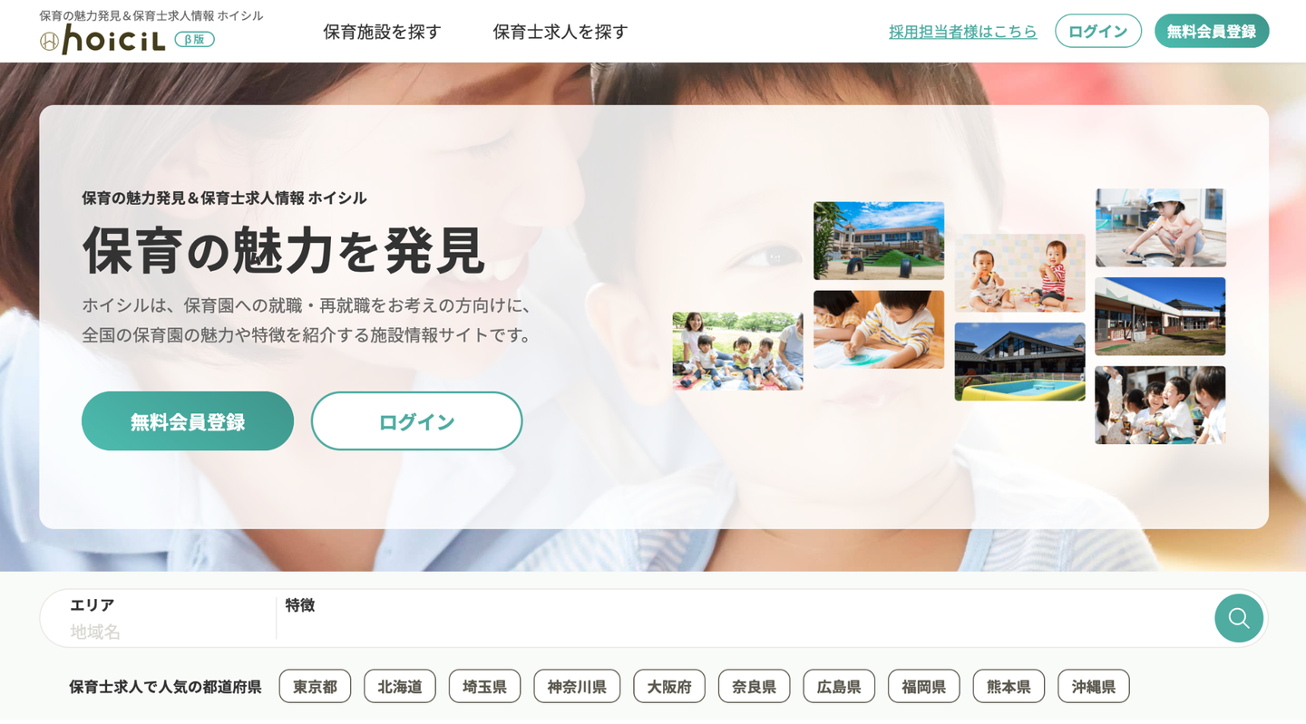 またこうして先生が保育士という仕事に誇りを持って働けたり、子どもと向き合うことに集中できる環境を整えた上で「保育士や先生は魅力的で専門的な職業である」ということを、学生や潜在保育士(※)にしっかりお伝えしていくことも大切です。これを実現するための新規事業が、全国の保育園の魅力や特徴を紹介する施設情報サイト、ホイシルです。