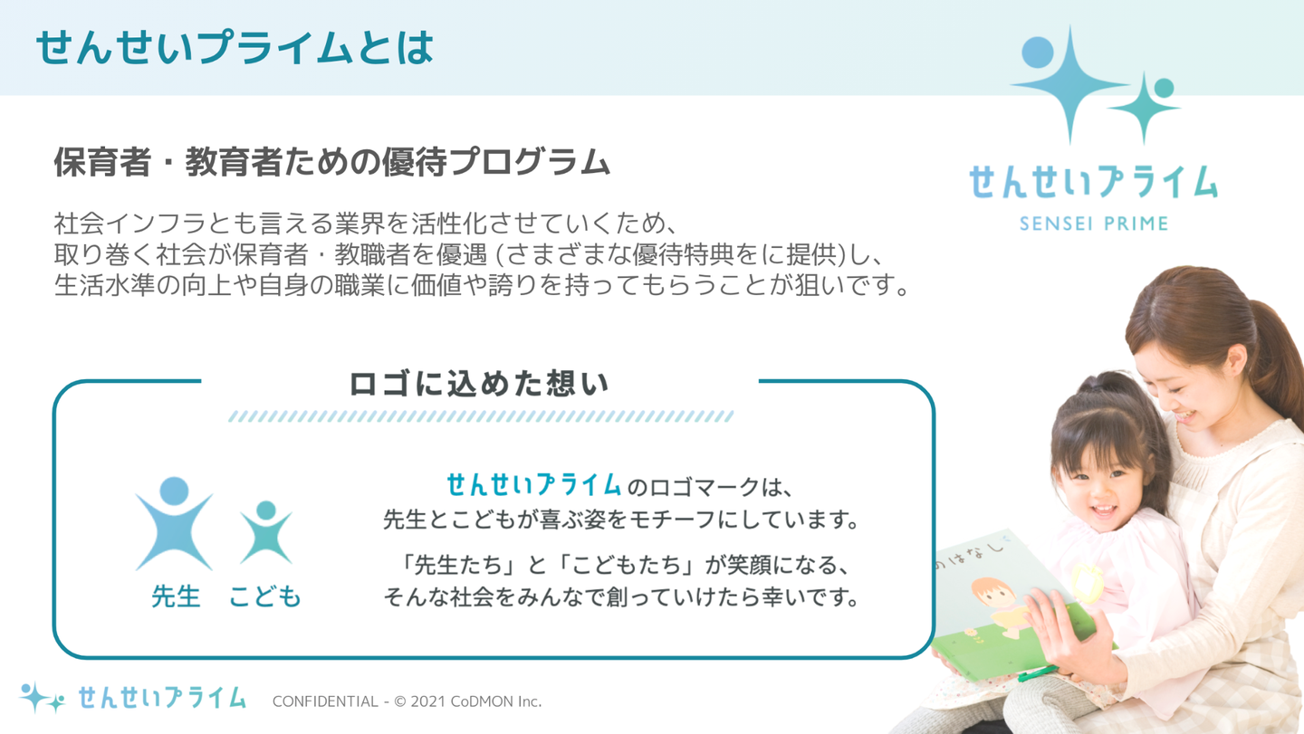 せんせいプライムは「社会的意義の高い仕事をしている『先生たち』がもっと評価され、応援される社会にしていきたい」という想いからはじまった「先生たちを社会が応援するプログラム」です。こども施設の職員の方であれば、資格の有無を問わず、サービスをお得に利用できる優待特典を受けられる仕組みになっています。