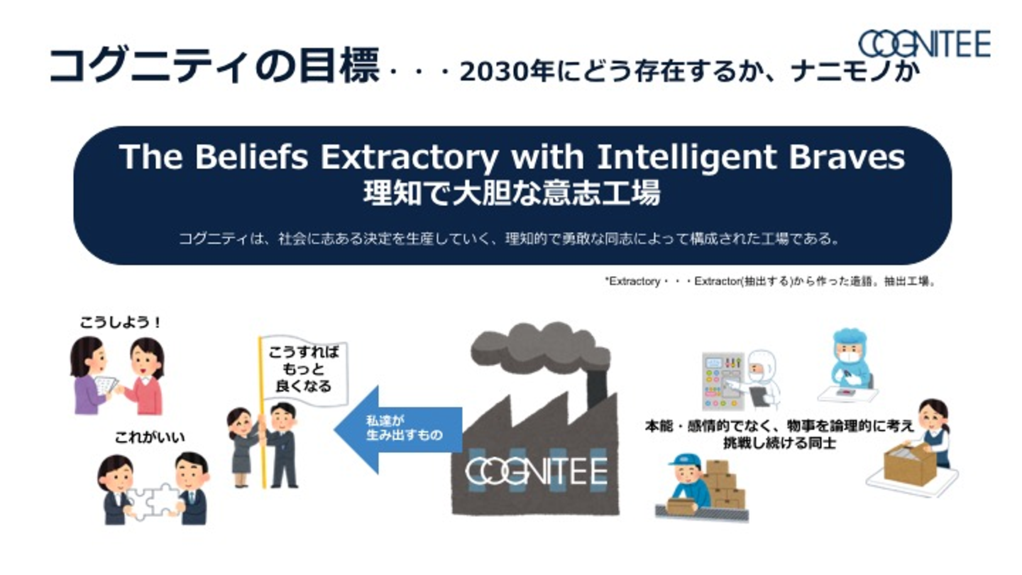 コグニティは、社会に志ある決定を生産していく、そして意志を持って働く同志によって構成された工場にしていく存在を目指しています。