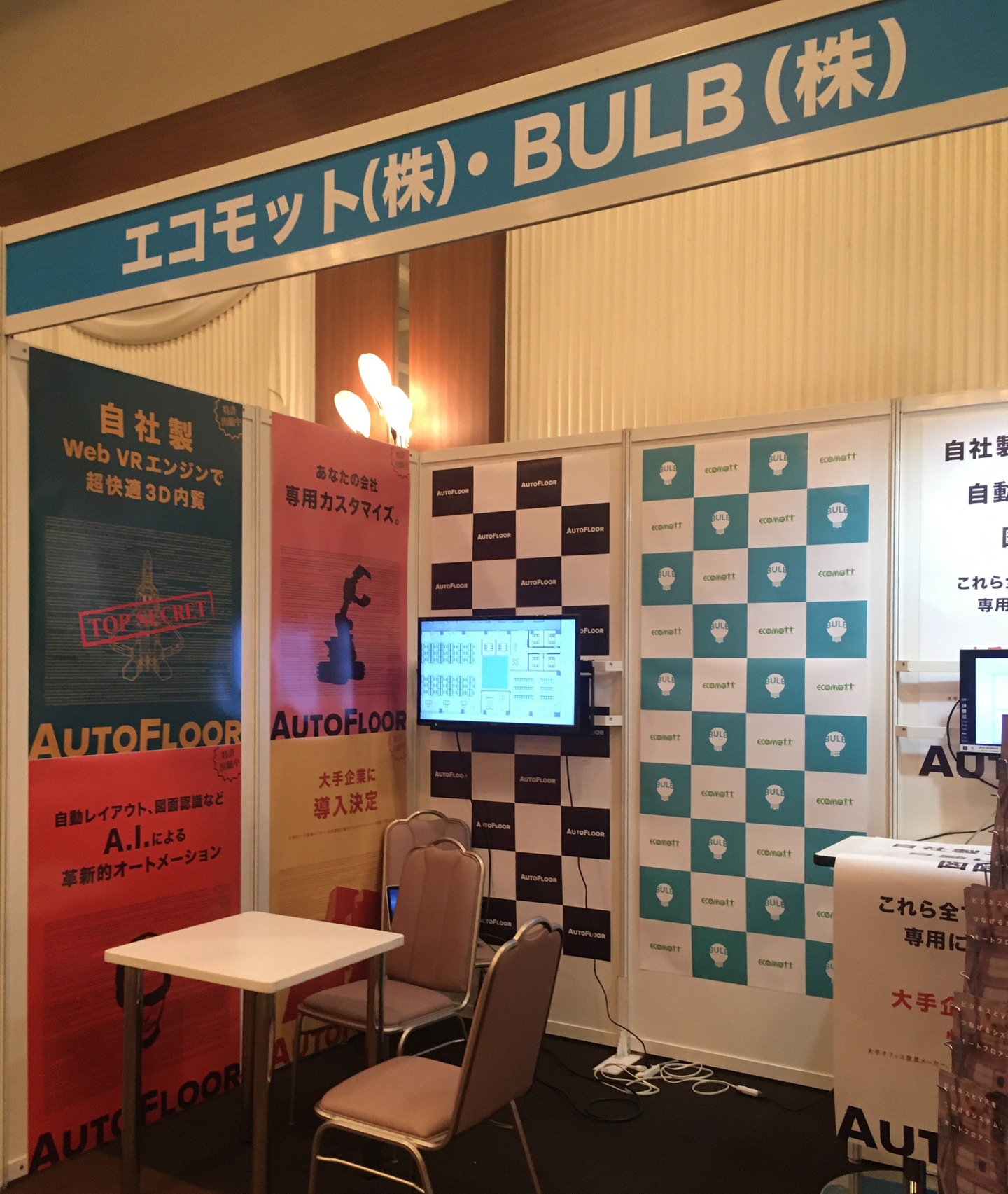 ブース中央には弊社とエコモット社の共同ロゴタイルポスターを設置し、両社の強烈なタッグを演出!!