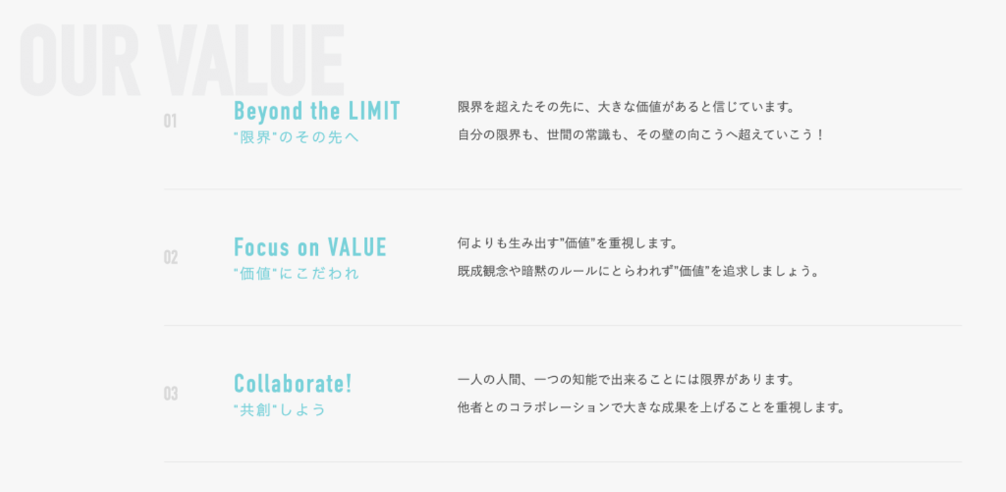 バリューを考えている時にいちばん最初に出てきたのが、この「Beyond the LIMIT」でした。私たちが限界だと思っていることの多くは、実は本当の限界じゃないんですよ。もちろん、物理的な限界はあります。例えば、100メートルを1秒で走ることはできないですけど、今からセールス活動で100社の飛び込み営業することはできます。決して、やれと言っているわけではありませんので安心してください(笑)。