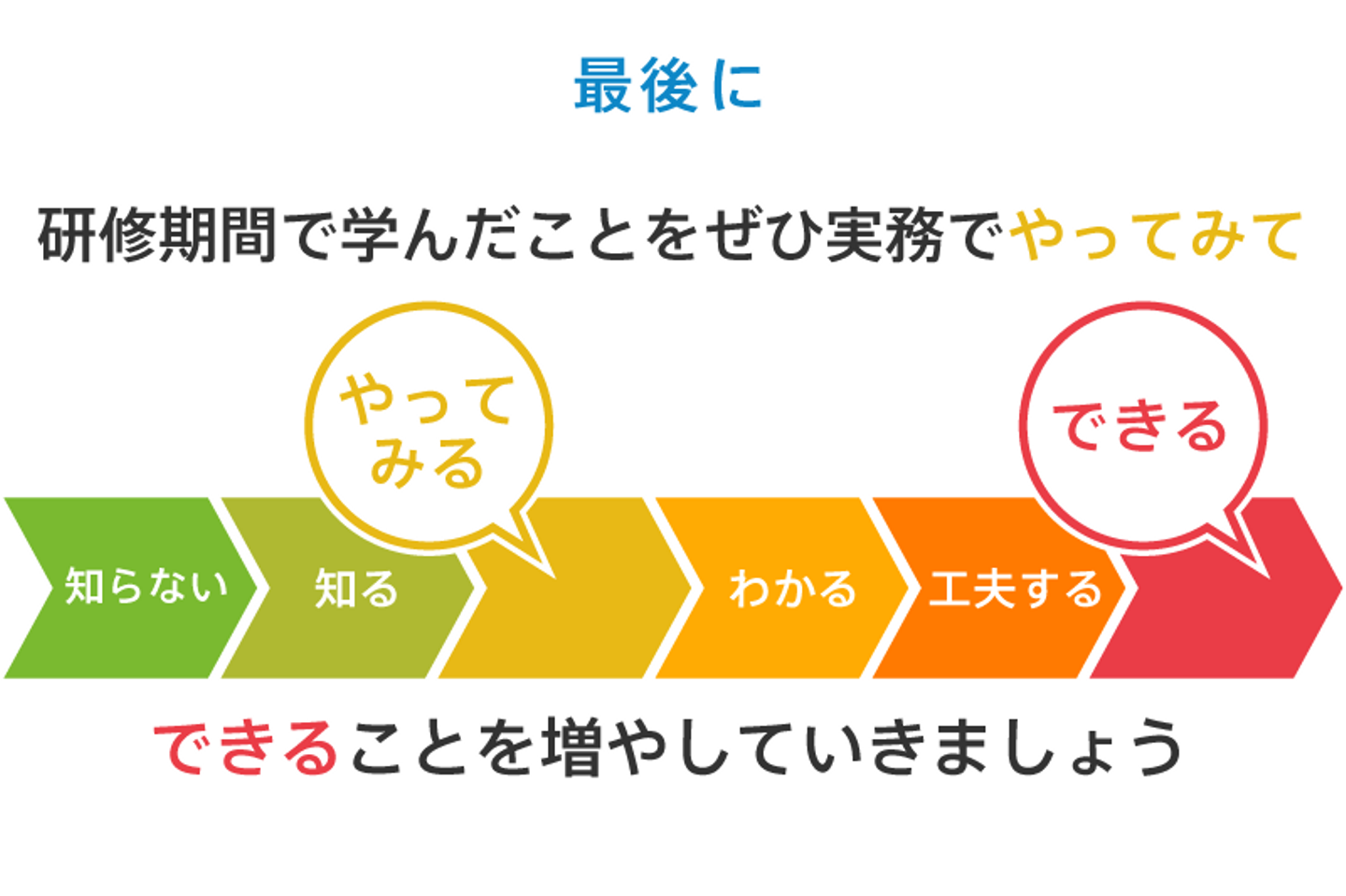 私が研修を通して学んだのは、まさにこのフローに沿った「学び方」であり、配属後も焦ることなく着々と「わかる」ことを増やしていける行動のヒントであったことを、研修終了後に認識しました。