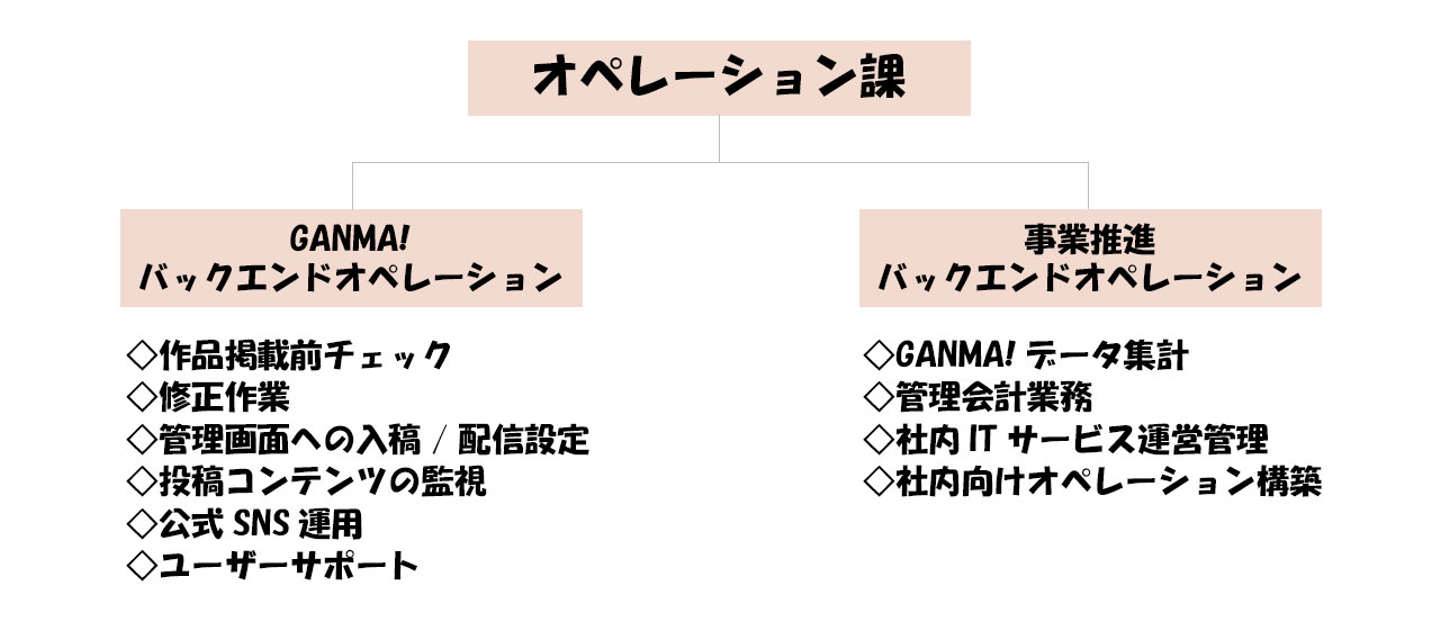 そのために現在オペレーション課では、自社マンガアプリ「GANMA!」のサービス品質向上を目的としたバックエンドオペレーション業務から事業推進における業務効率化・最適化のための業務改善提案をおこなっています。