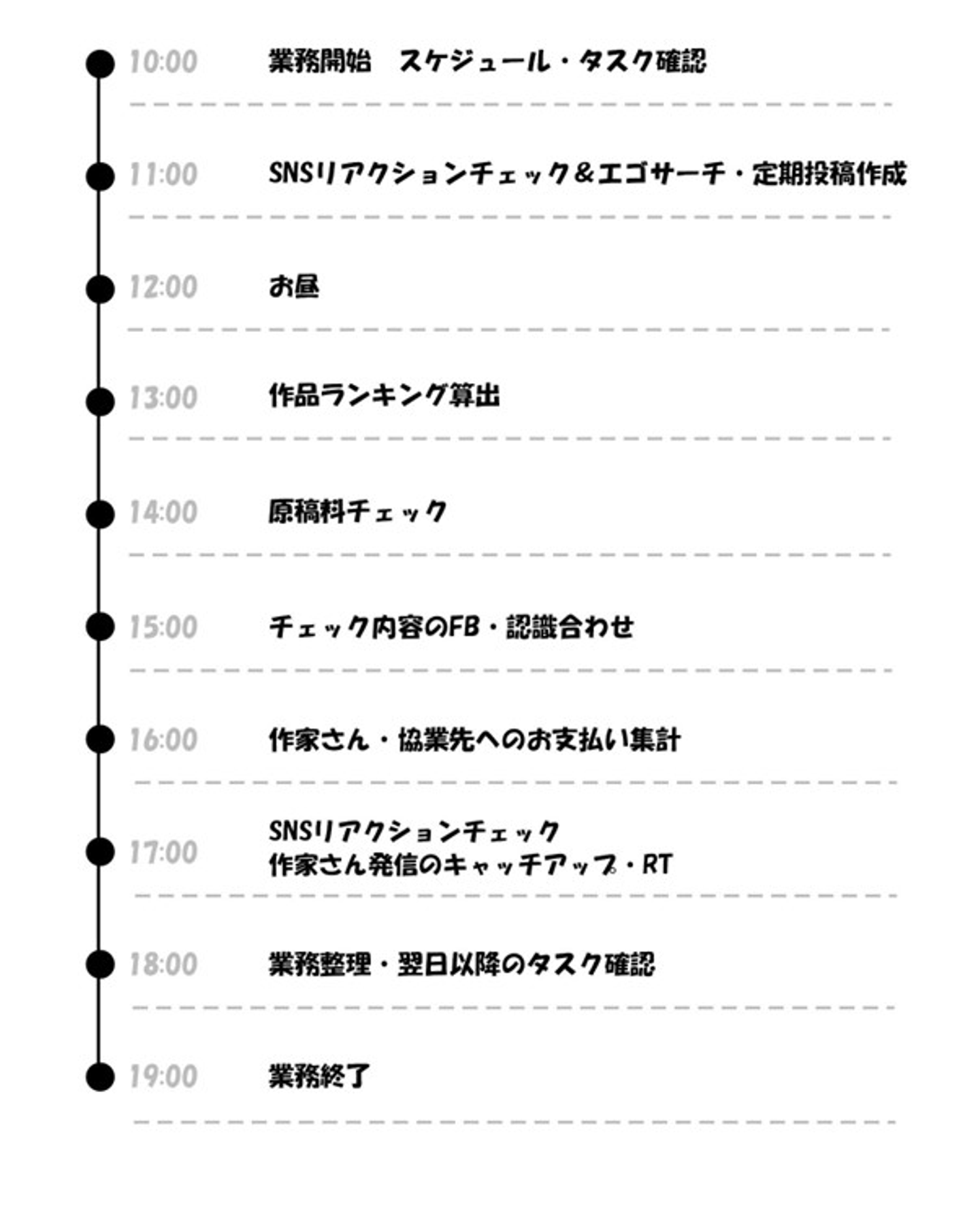 管理会計の取りまとめ業務も担っており、毎月約200名近い作家さんへの支払い集計や関係部署連携をおこなっています。抜け漏れなど発生しないようチェックを徹底しつつ、「会社の経営をよりよくするためにはどうすればいいか」 という観点で、フローの見直しも視野にいれながら業務を遂行しています。