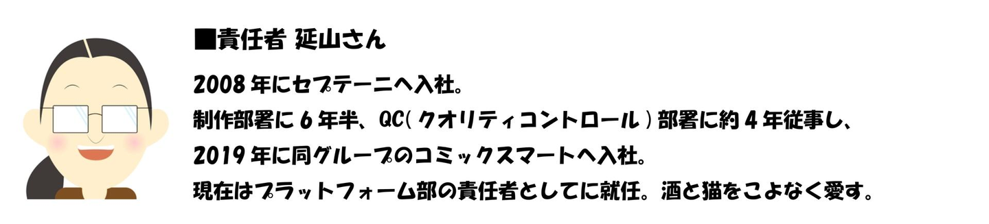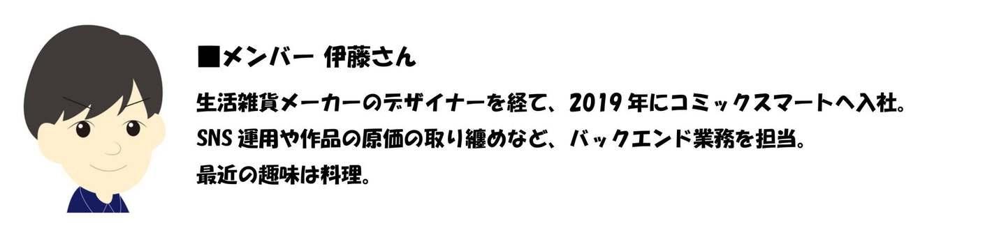 前職でメーカーの生産進行管理をしていました。沢山の情報を集約してプロジェクトを滞りなく遂行する能力は、今のオペレーション課の業務にも生きています。コミックスマートに入社して身についたスキルは、業務領域が多岐にわたることから様々な情報を取り扱うので情報整理力や概念化能力が備わったと感じています。