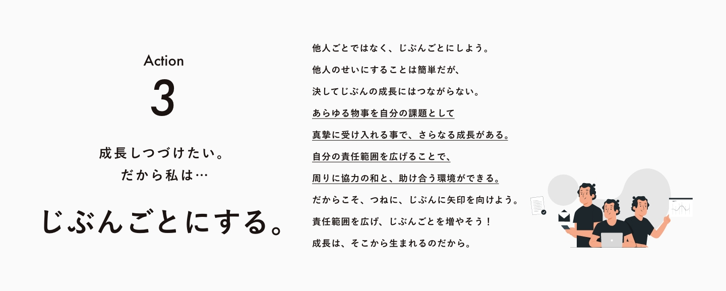 「じぶんごとにする」。これはすべての物事を他人事ではなく「じぶんごと」として捉えて責任意識を持つことです。他人のせいにしたり、環境のせいにしたりするのはとても簡単なことなのですが、責任を押し付ければそこで自分の成長は止まってしまいますよね。