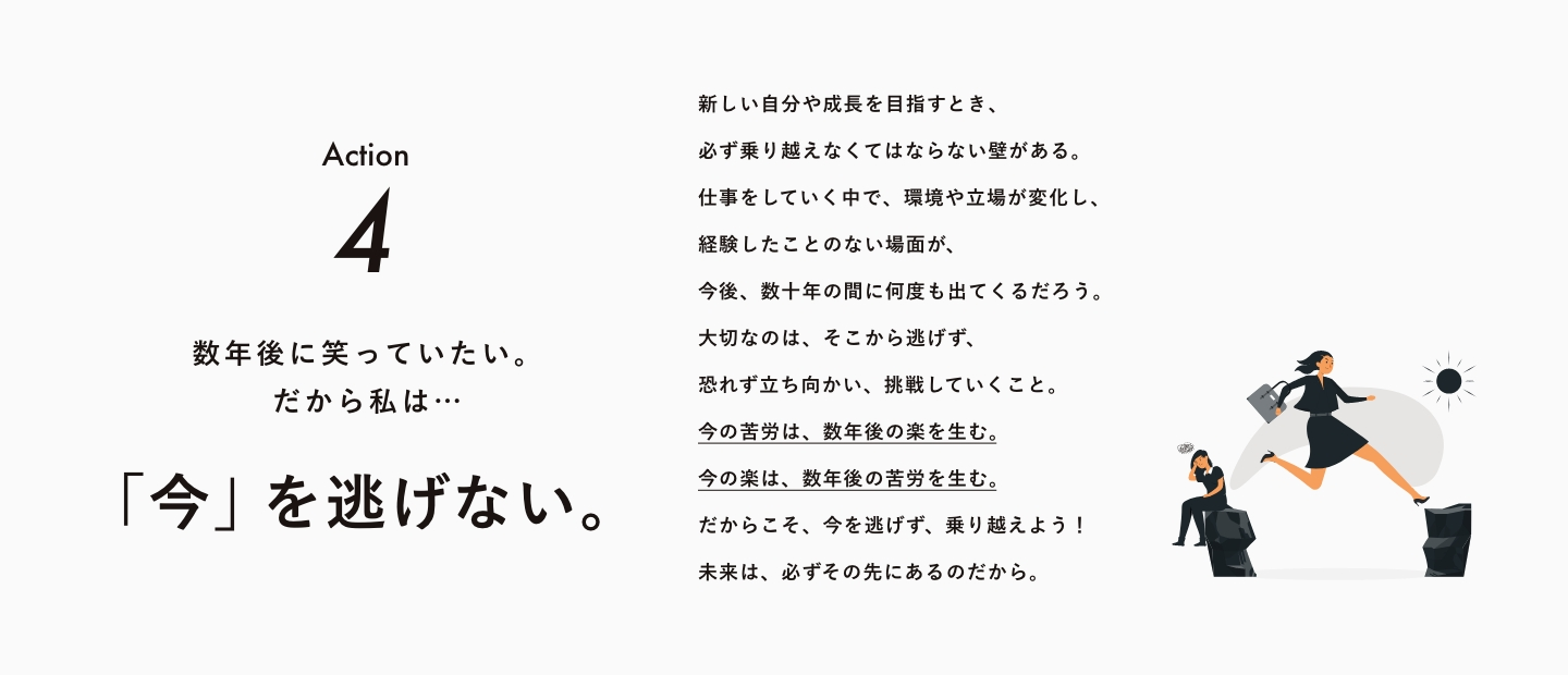 「今を逃げない」というのは仕事に対して発生する責任についてです。時には辛い思いや、立場の変化で責任の重圧感に逃げ出したくなる時もあると思います。ただ、大切なのは、その状況を楽しめるかどうかじゃないかなと思います。「キツイ、もう逃げ出したい!」と考えるか、「これを乗り越えたらまた成長できる!」と考えるかで、だいぶ変わってくると思うんですよ。