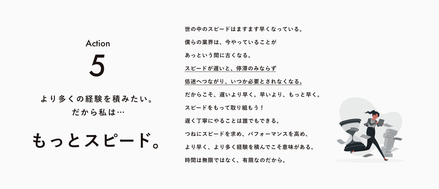 この業界で働く上で、スピードを求めることはかなり重要だと思います。「もっとスピード」は限られた時間の中で、「何ができるか」「何を残せるか」を意識して行動することです。ビジネスとして成立させるために、クライアントの要望と私たちのできることのバランスを考えることも重要ですね。早く仕事をすれば、依頼されたことだけじゃなくて何か付加価値を生み出せる余裕も出てくるかと思います。