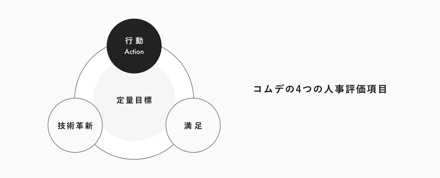 6月から新しい人事評価制度を始めるにあたり、4つの大きな評価項目を作成しており、その一つに「行動」という項目を作っています。単純に売上・利益を求めるだけでなく働く人が同じ指標を持つことも重要だと考えているので、コムデでは数字だけでなく一人一人の「行動」を根幹に据えています。