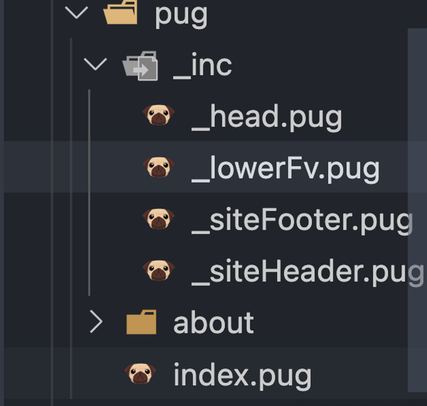 下層ページを構築しているindex.pugとは別にコンポーネント用のパグファイルを作成します。(今回_lowerFv.pugというファイル名で作成しています)