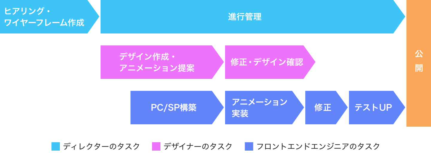 制作の流れ自体は他の案件と変わらず、まず私の方から企業様に打ち合わせでヒアリングをしてそこからスケジュールを決める、そしてエンジニア・デザイナーと情報共有する、といった流れです。