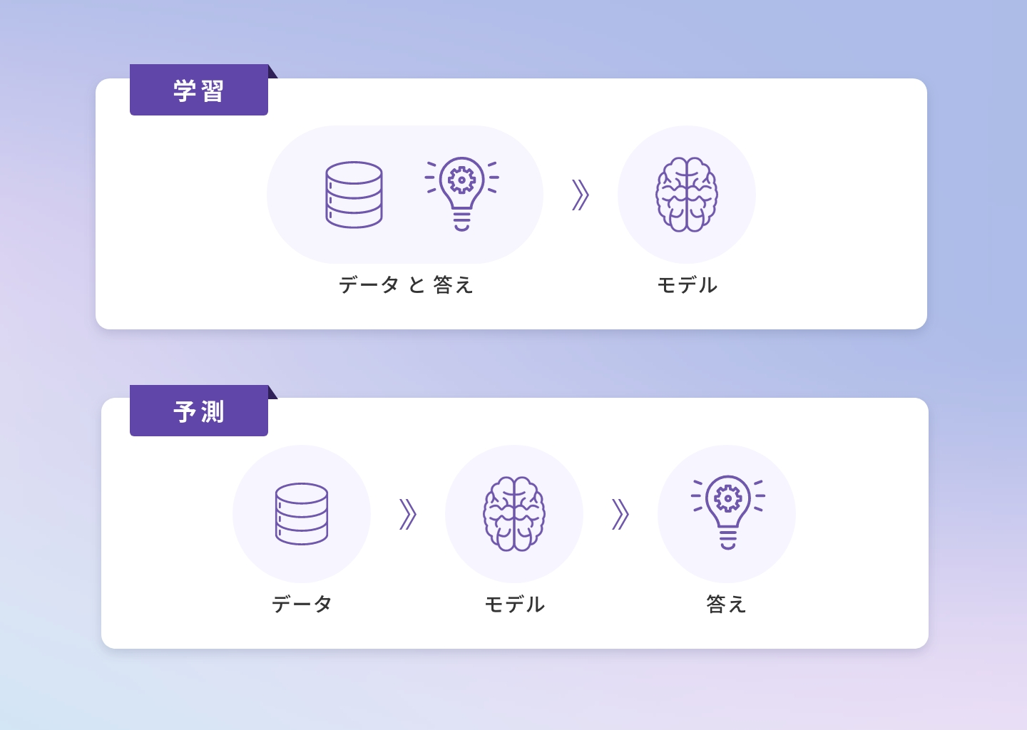 この機械を「モデル」と言い、学習が終わったモデルを「学習済みモデル」と言います。「学習済みモデル」が手に入ったら、そのモデルに対してデータを入力することで、予測結果を得ることができます。