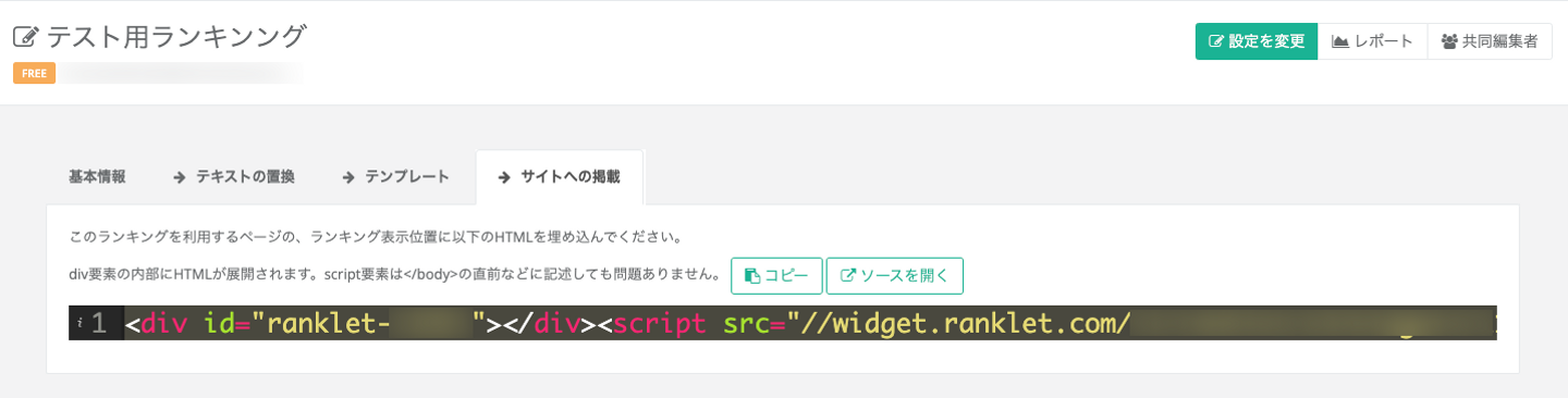 ③専用タグの埋め込み 発行されるHTMLをランキングを表示したい位置に埋め込みます。