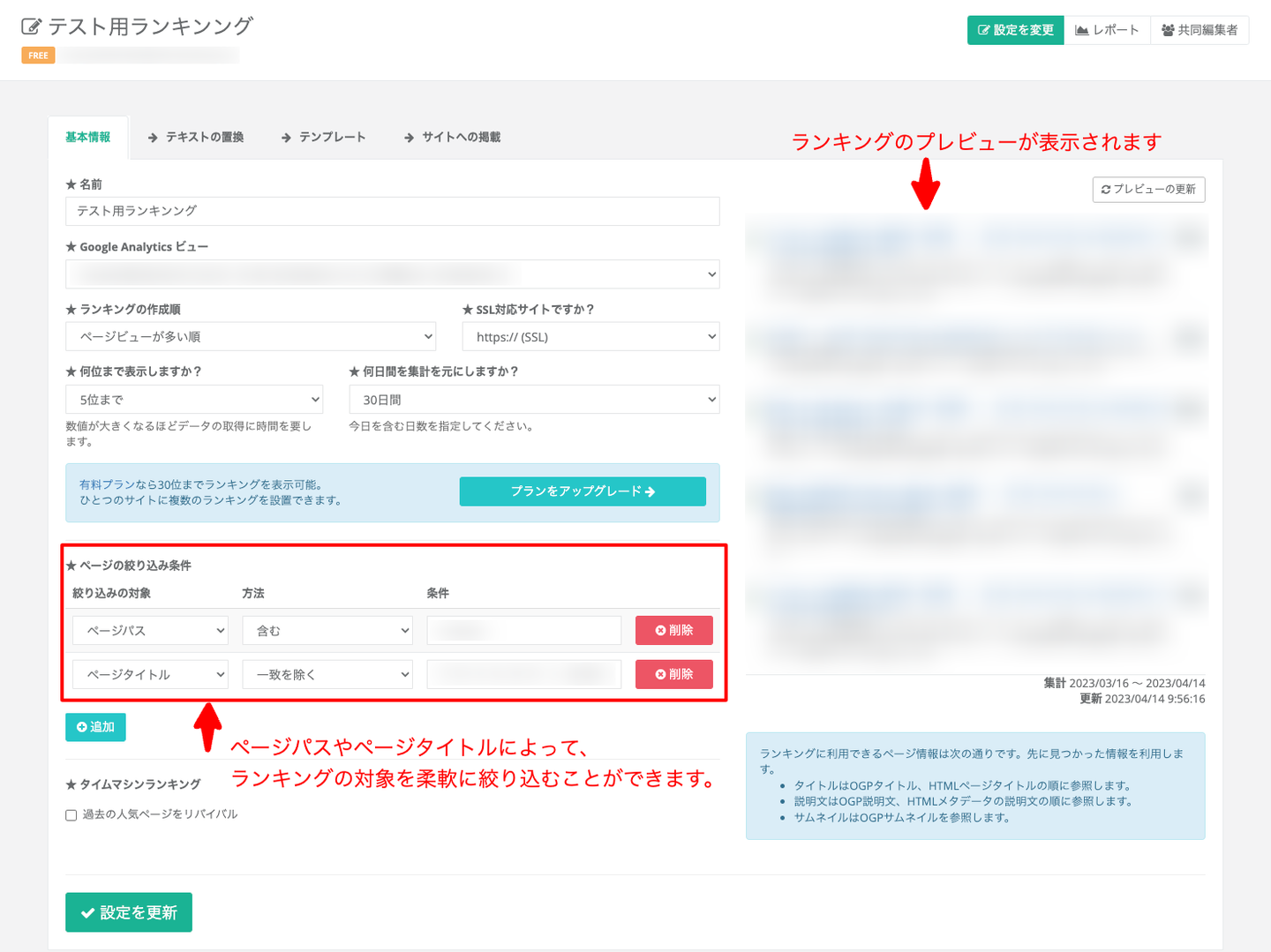 ランキングのテンプレートもカスタマイズすることができるので、とても便利です! 無料版では、ランキングの作成は1つのみでサービスクレジットの表示があるため、必要に応じて有料版をご検討ください。