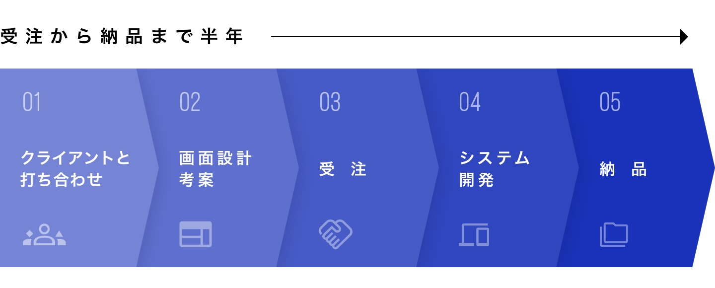 その上で、インフラを整えるために必要な規模感やシステムの細かい仕様の要望の打ち合わせを行い、それらに適した画面設計やインフラの構築を提案します。