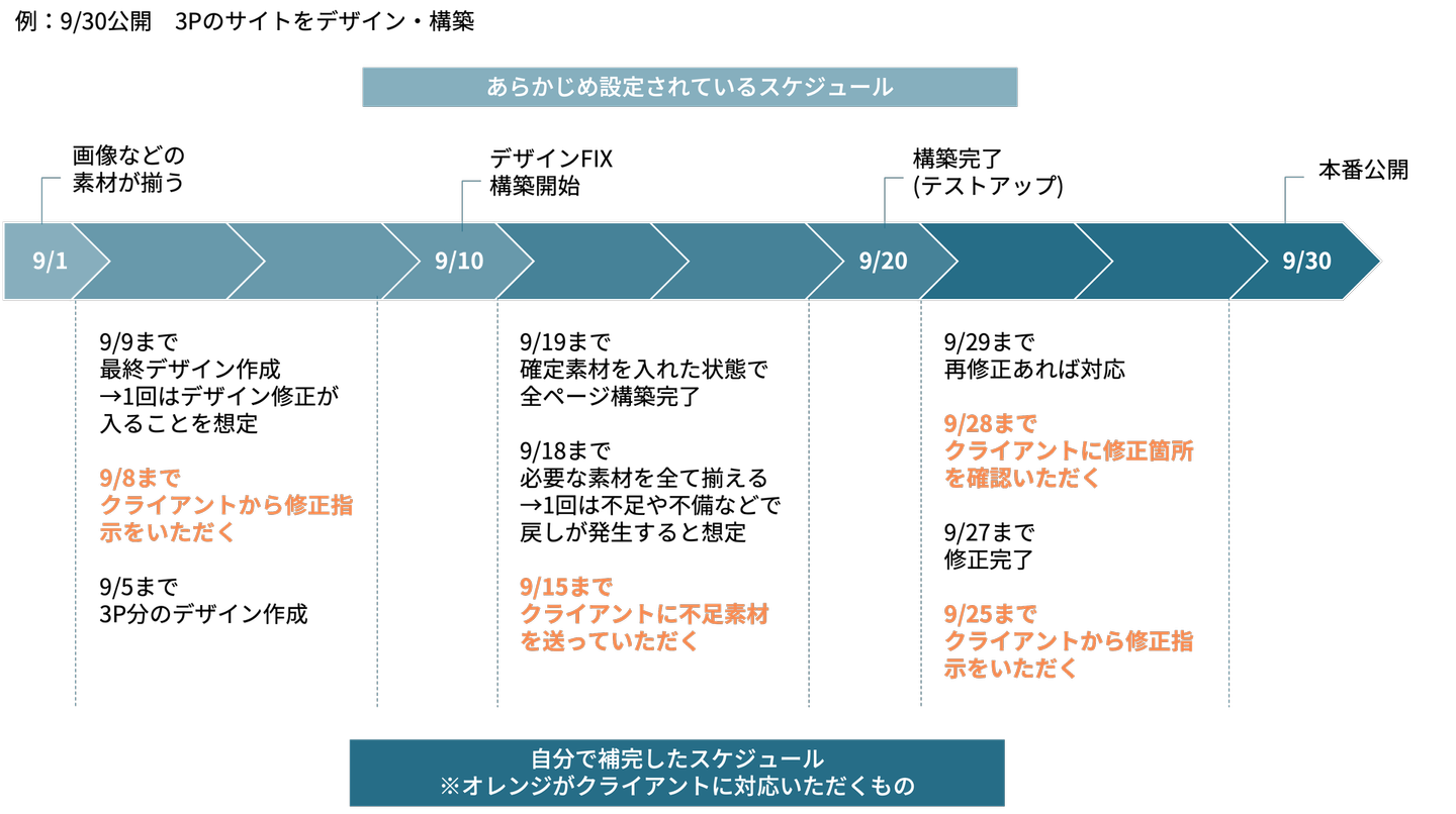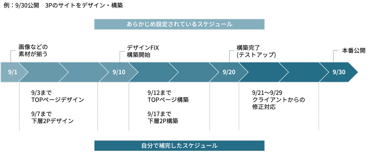 Webサイト3P分のデザイン・コーディングを受注をし、クライアントから「9/1までには素材が出揃うから、それからデザインを始めて9/30には公開したい」と注文をいただく