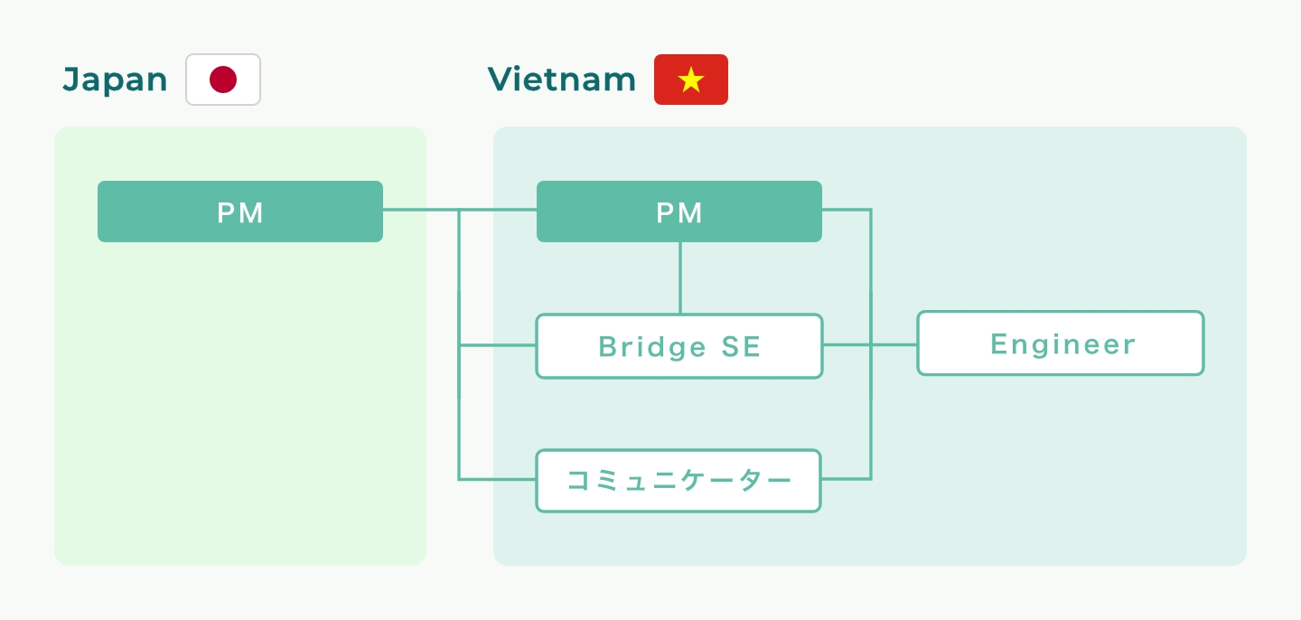 日本のアプリチームでアサインされたメンバーに加えて、ベトナム拠点のエンジニアが案件のメンバーが対応言語やスキルを基準にアサインされます。そしてこの二カ国の制作陣を繋ぐのがBridgeSE・コミュニケーター・プロジェクトマネージャーの3人。