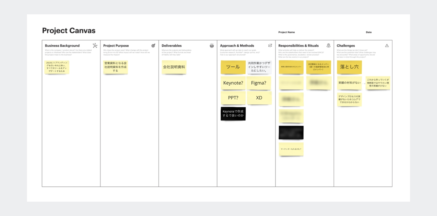 まず、プロジェクトの目的や方向性を定義するために「プロジェクトキャンバス」を作成しました。