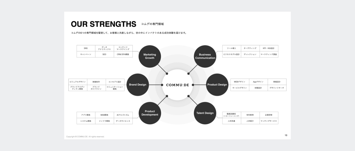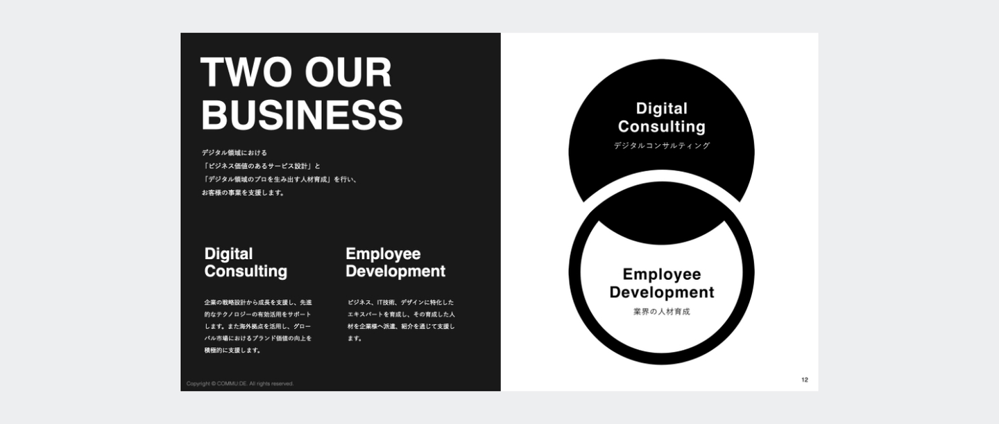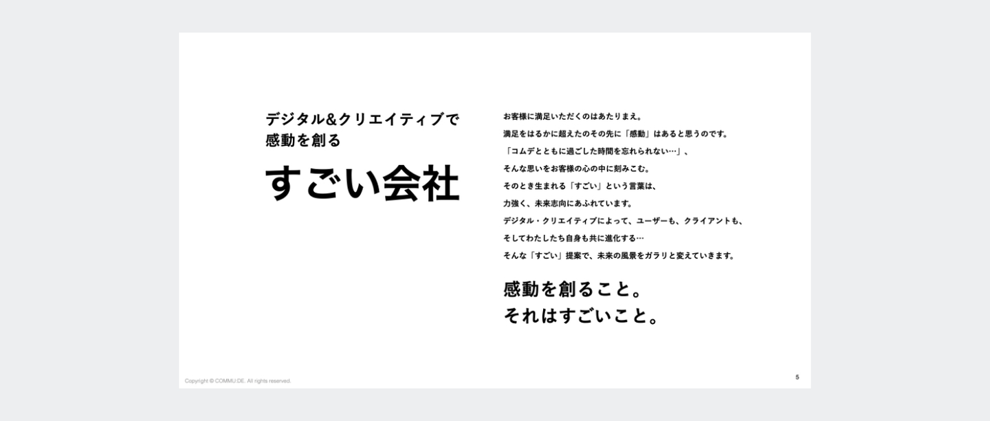 コムデのブランドイメージであるモノトーンを基調に、他社との差別化を図りながらも、クライアントが読みやすいデザインを心がけています。