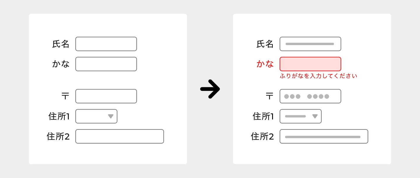 また、入力エラーが発生した箇所にはわかりやすく何がエラーになってしまったのかを見やすい文字で視認できるような画面表示が必要です。