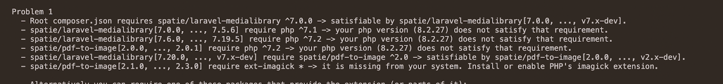 "spatie/laravel-medialibrary": "^11.0"その後、再度以下のコマンドを実行します。