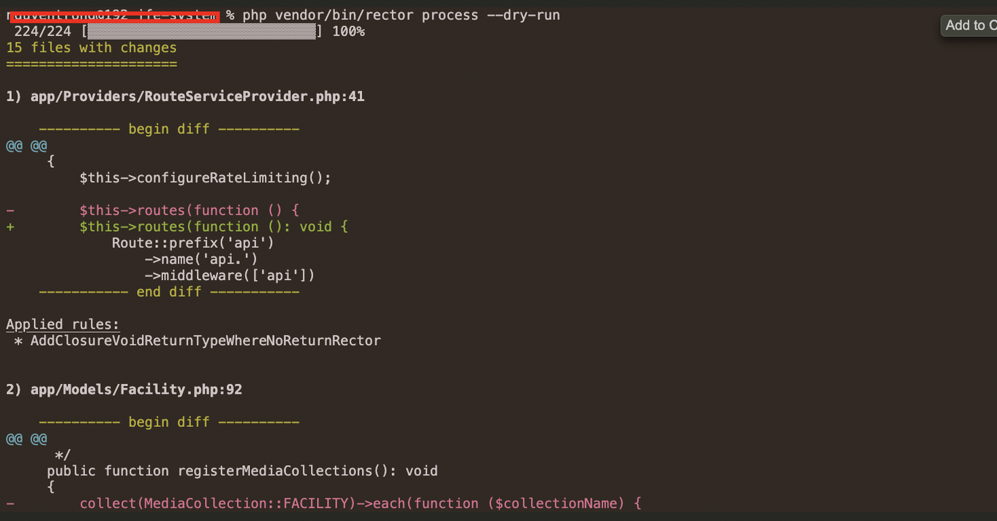 php vendor/bin/rector process --dry-run問題がなければ、以下のコマンドで実際のコード修正を適用します。