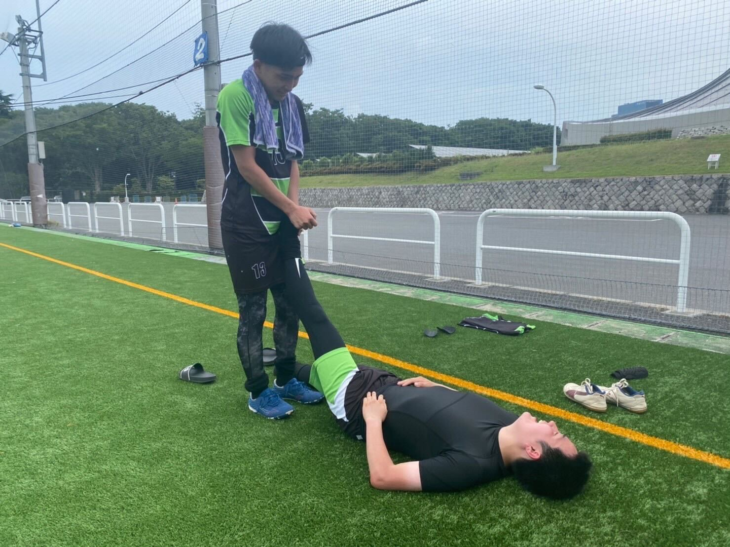 ↓試合後の様子。社内でもイケメンと噂のリッキー(左)とオクサ(右)が柔軟しています。オクサが少し腰が痛いと言っていたので少し心配です。