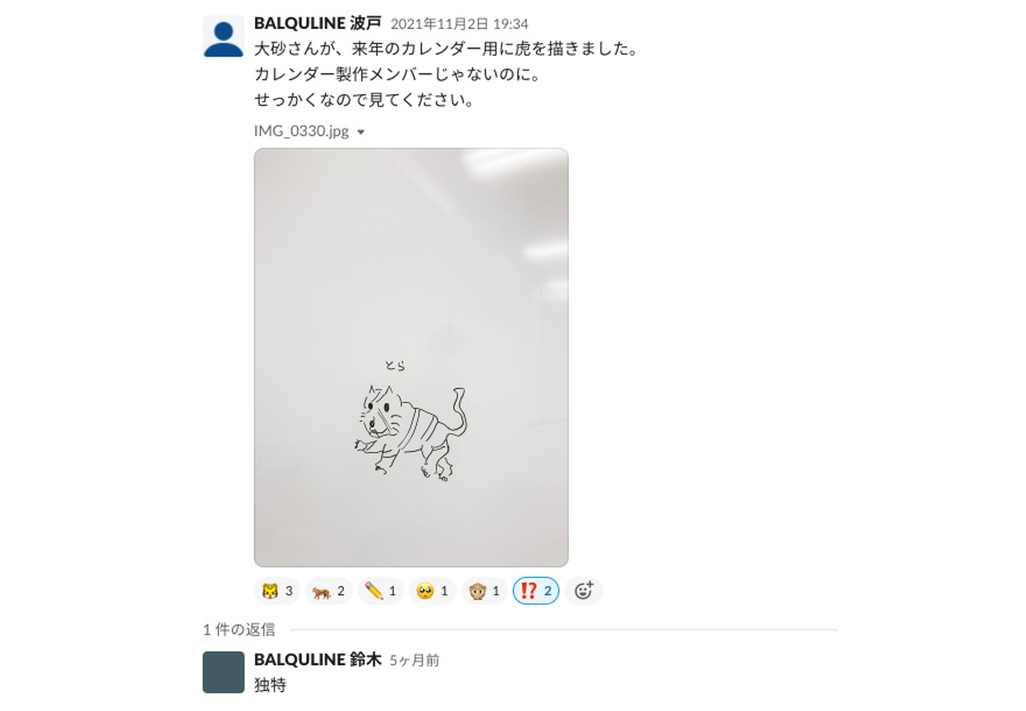 また、制作実績の共有で社内チャットを使うのであれば、同時にもう一つ雑談用の部屋を作ってはどうかと提案があり、そちらも実際に運用しています。