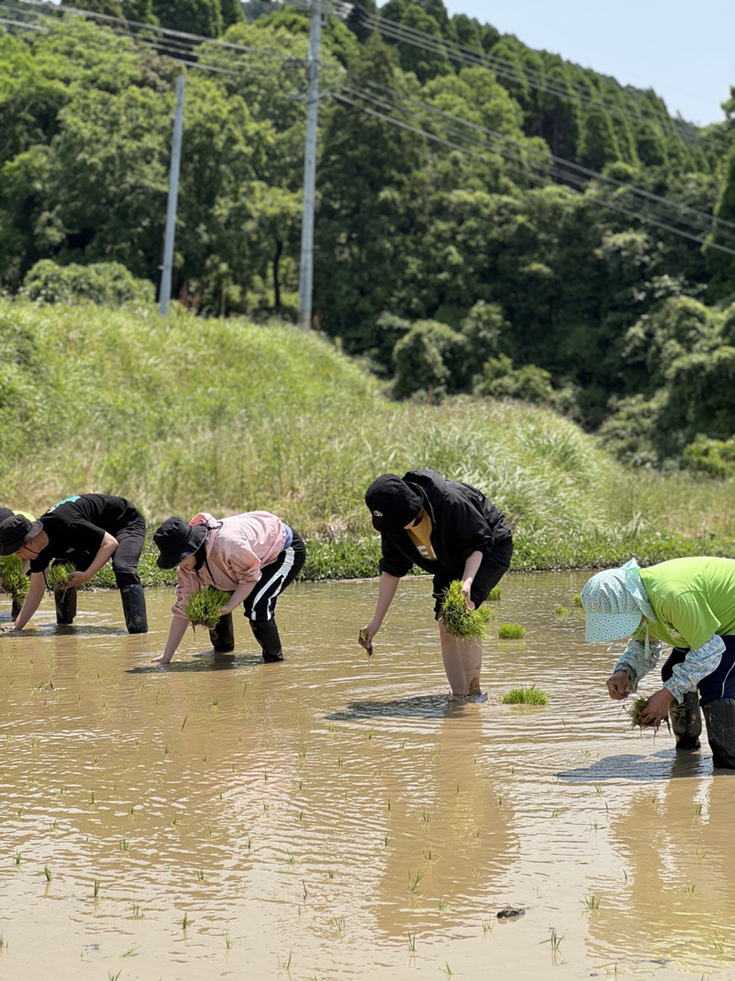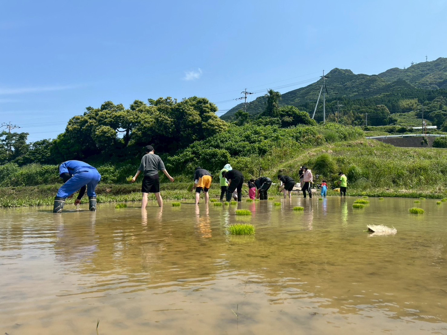 地元の方に、植え方のコツや、腰が痛くならない姿勢など教えてもらい「これできてるかな」「植えすぎ?」それぞれが感触を確かめながらすすめていきます。