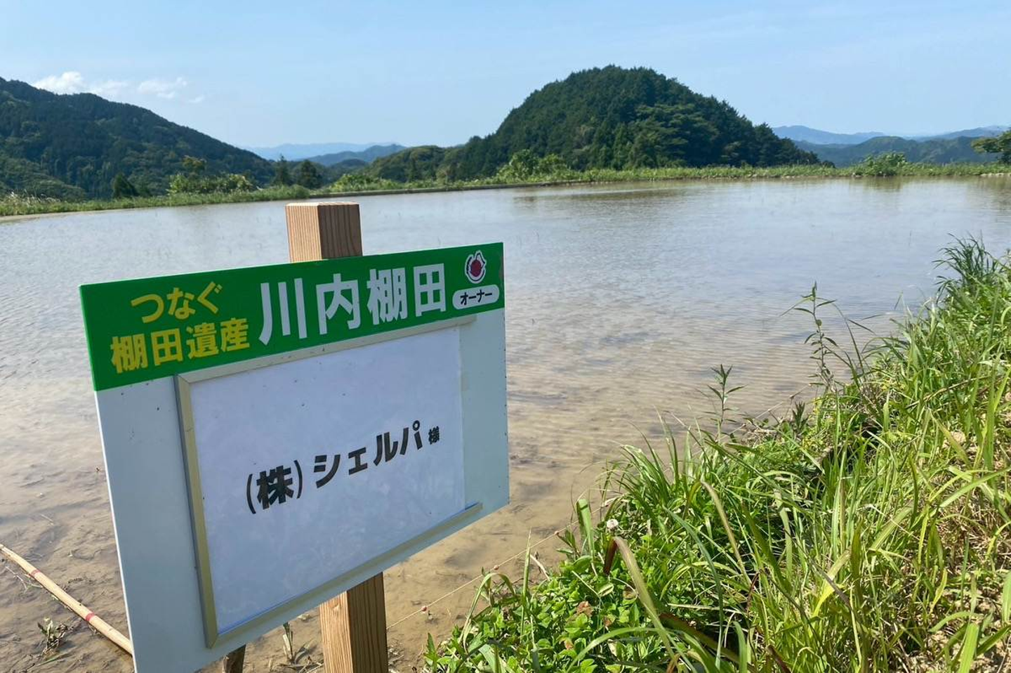 目の前に広がる、棚田の風景。そして田んぼの片隅に立てられた「シェルパ」の名前入りの看板に