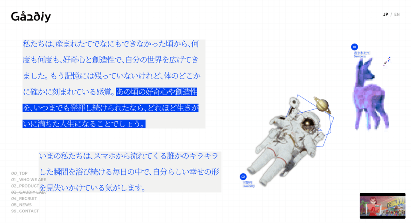 石川:当初から「今までにないものをつくりましょう」と話していた覚えがあります。今後、Gaudiyが本格的にグローバルに挑戦することを考えると、海外の方々にも「唯一無二な会社」という印象を抱いてもらえるように、クリエイティブの部分にこだわったコーポレートサイトをつくり込みたいと考えていました。