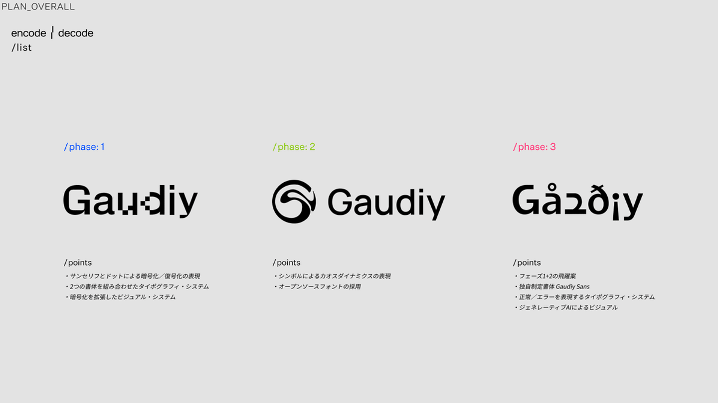 石川:「エンコードとデコード」のコンセプト、そして「バグってるロゴ(文字化け案)」を最初にみた時に、良い意味での “違和感” を抱きました。一方で、デザインとして違和感が絶妙にコントロールされているのを見て、Gaudiyらしいなとも感じました。
