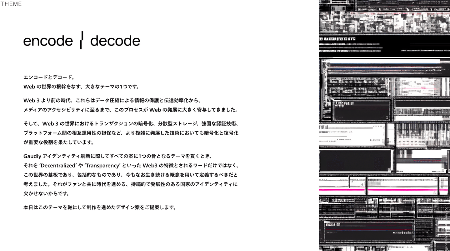 タカヤ:今回はヒアリングやリサーチ内容から思考したというより、制作途中のサイトを拝見させていただいた際に、その「インターネット初期のプロトコル感」にインスピレーションを受けたんです。そこで感じたのは、「分散型」や 「透明性」といったWeb3に特徴づけられるワードというよりは、Webという包括的な世界でGaudiyの在り方を表現したいなと。
