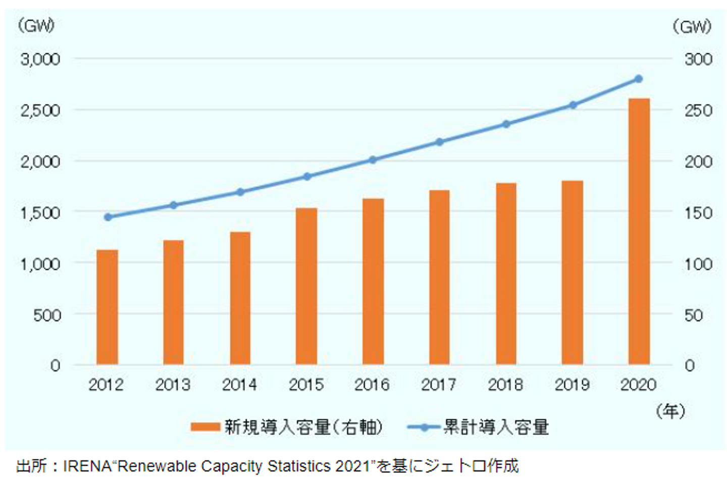 2020年の世界の再生可能エネルギーの新規導入容量は前年比45.1%増の261ギガワット(GW)と過去最高となりました。これにより、世界の設備容量に占める再生可能エネルギーの比率は、2019年の34.6%から、2020年は36.6%に増加。年々増加傾向にあります。