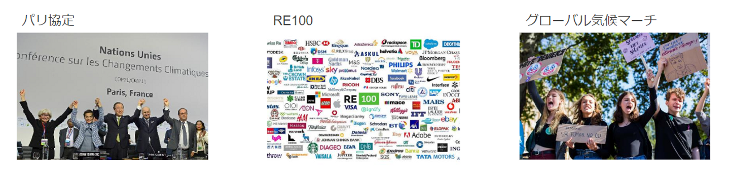 2015年のパリ協定、世界中で参加企業が増え続けるRE100、2018年には、スウェーデンのひとりの少女が世界に発したメッセージがソーシャルメディアで世界に拡がり、2019年9月20日には161か国約400万人を動かす史上最大の気候ストライキ(グローバル気候マーチ)を生み出しました。